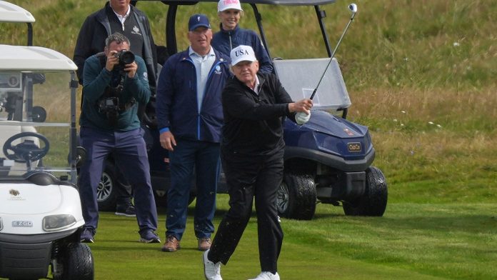 President Donald Trump is shown playing golf at Trump Turnberry in Turnberry, Scotland, on Saturday, July 26, 2025. (AP Photo/Alastair Grant)