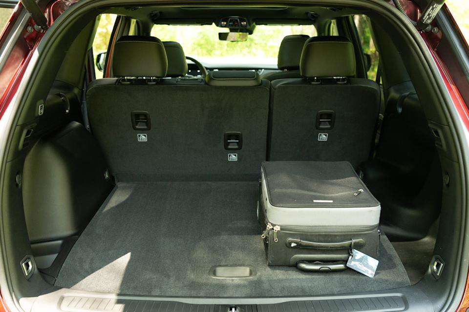 The 37.7 cubic feet of cargo space in the back beneath the powered hatch, expands to 70.8 if you fold down the seats.