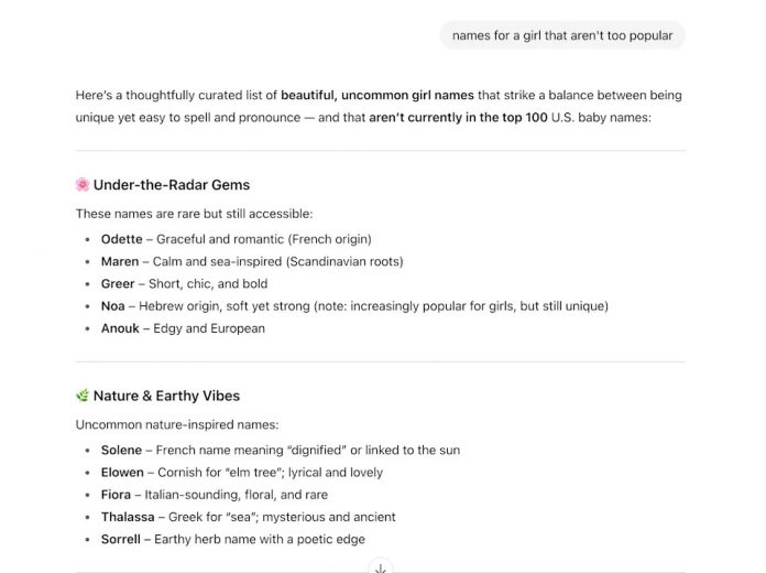 To test out ChatGPT’s naming capabilities, I entered a prompt asking the service to give me girl names that aren’t too popular. It returned within seconds with 24 names across four different categories. There were “nature-inspired” names like Marigold and Clover, “literary or vintage vibes” like Isolde and Odette, “whimsical & soft” names like Seren and Elowen and “international gems” like Anouk and Saskia. I responded by asking for names that specifically start with A and was given 25 names, including Alma, Ayla and Ariadne. For what it’s worth: None of the names that were suggested by ChatGPT registered as options I would genuinely consider using.