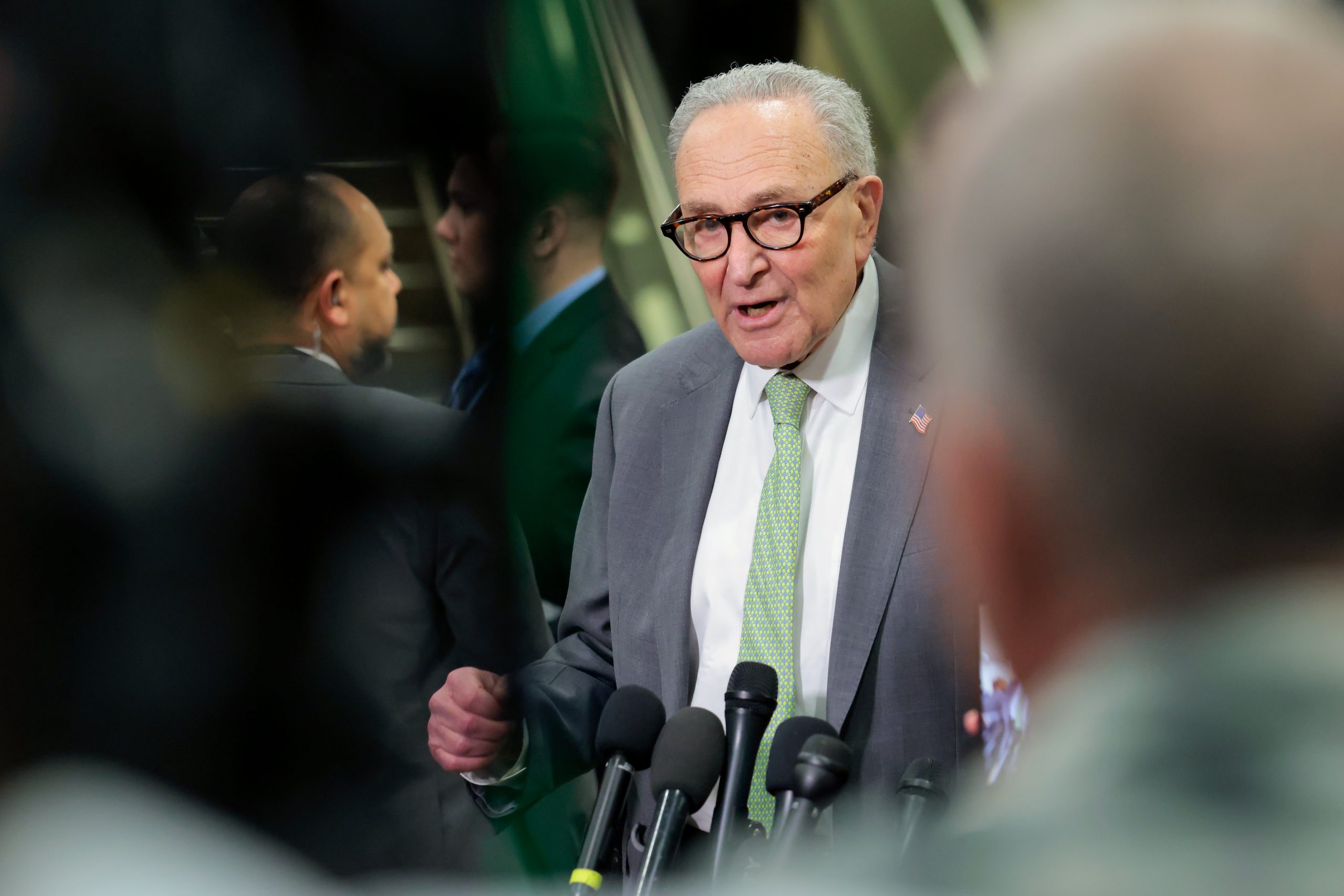 Sen. Minority Leader Charles Schumer, D-N.Y., speaks to the media as Cabinet officials deliver congressional briefings on Iran at the Capitol in Washington, March 3, 2026.